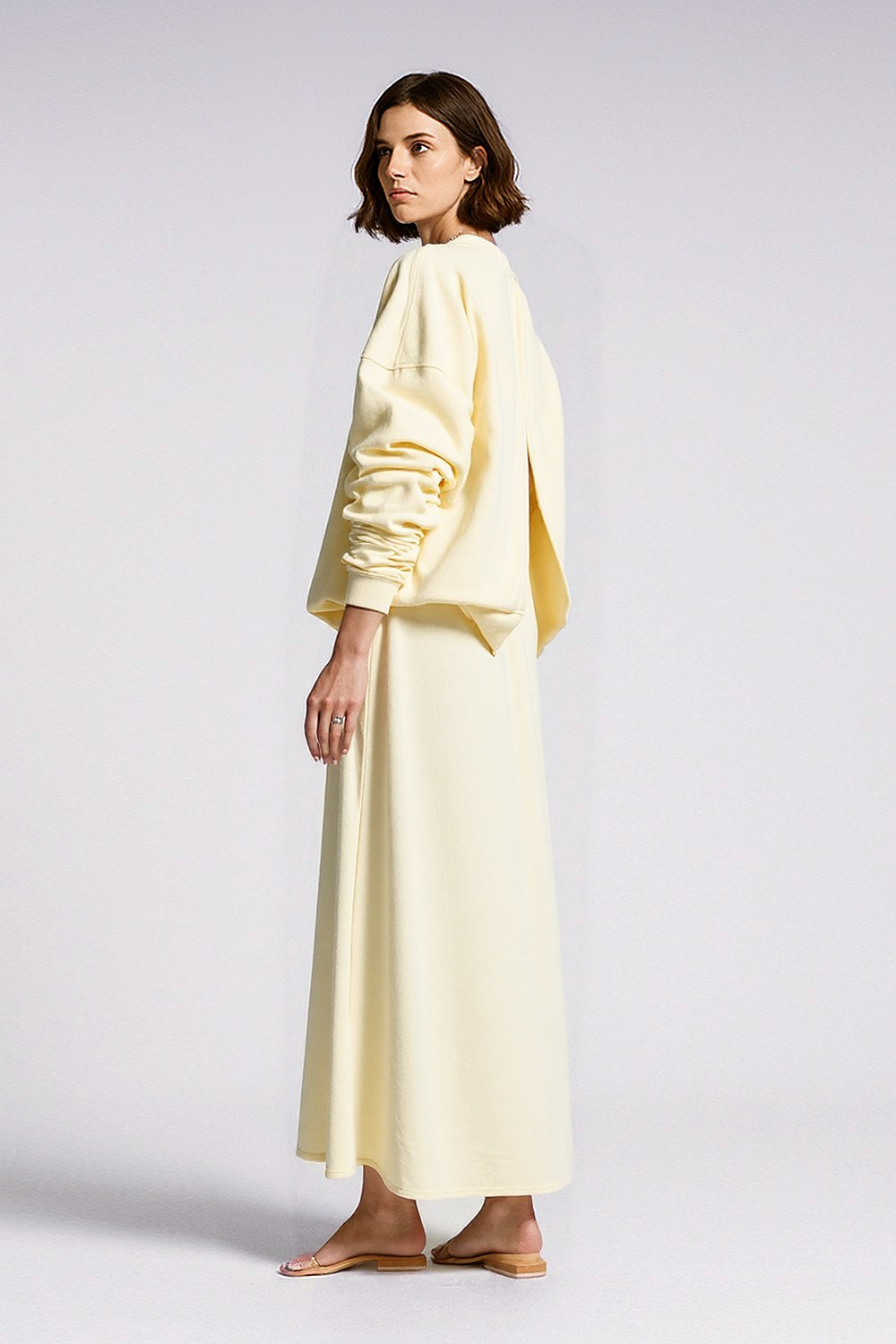 Klasyczny przód, a z tyłu — niespodzianka. Subtelne rozcięcie na plecach dodaje lekkości, przewiewności i… odrobiny kokieterii.
